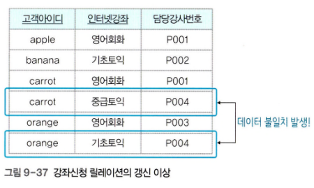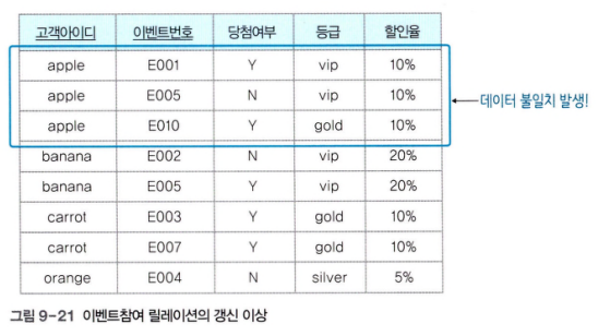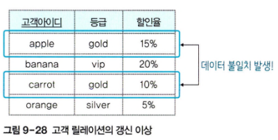 - 갱신 이상 : 고객 릴레이션에서 할인율 속성을 변경하면 모든 투플에 할인율이 동일하게 변경해야 한다. 만약 한 투플만 변경되면 데이터 불일치가 발생한다.