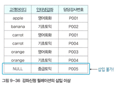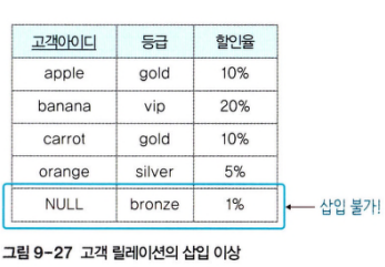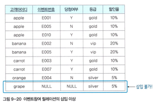 - 삽입 이상 : 고객 릴레이션에서 새로운 등급을 생성하고 그 등급에 속하는 고객이 없다면 개체 무결성 제약조건을 위배하여 삽입할 수 없다.