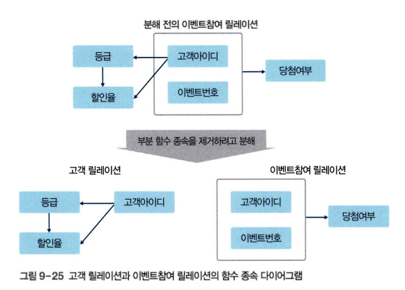 - 이벤트참여 릴레이션에서 고객이름은 고객아이디에 완전 함수 종속되어 있지만 {고객아이디, 이벤트번호}에는 부분 함수 종속되어 있다. 그리고 당첨여부는 {고객아이디, 이벤트번호}에 완전 함수 종속되어 있다.