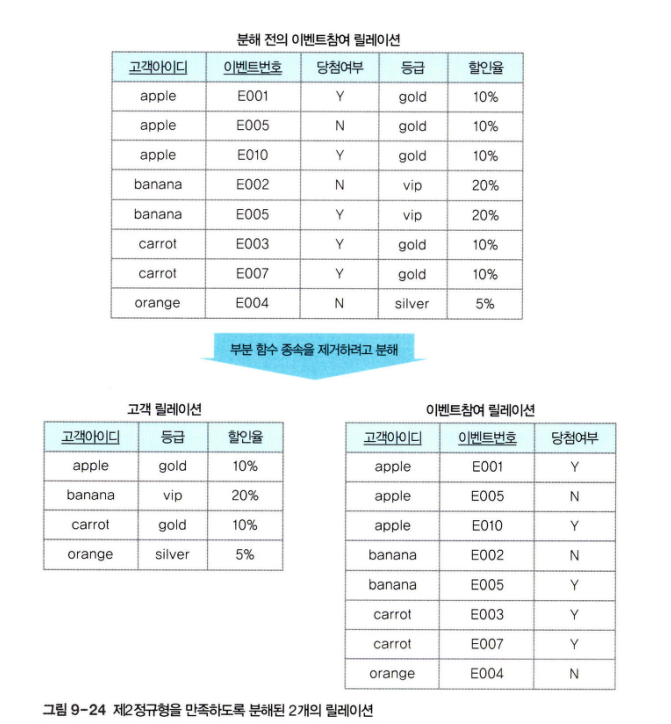 - 제2 정규형을 만족하려면 부분 함수 종속을 제거하고 모든 속성이 기본키에 완전 함수 종속되도록 릴레이션을 분해하는 정규화 과정을 거쳐야 한다.