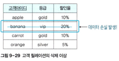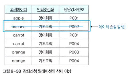 - 투플을 삭제하면 꼭 필요한 데이터까지 함께 삭제되는 데이터 손실의 문제