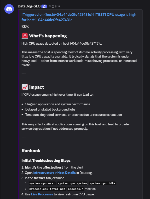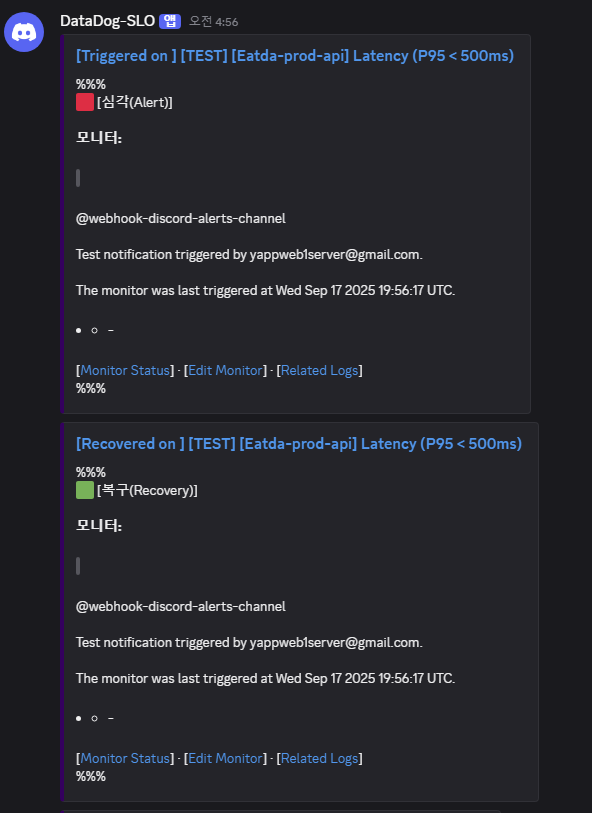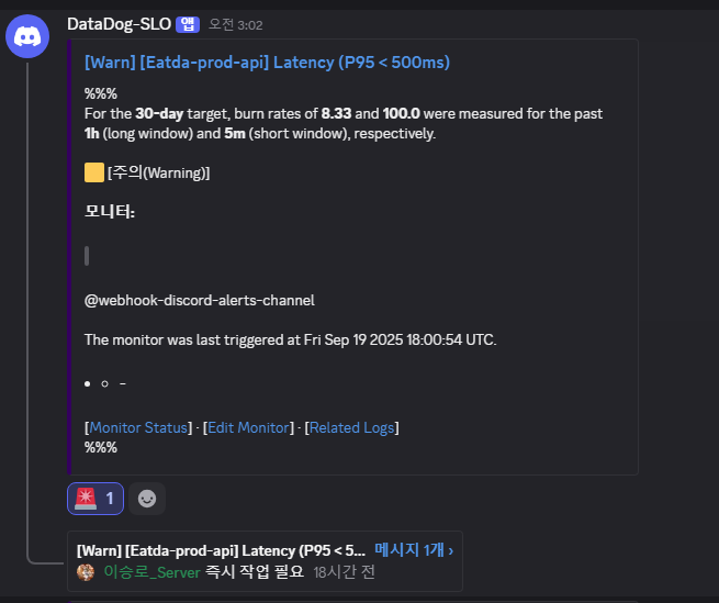 설정된 SLO를 기반으로 다음과 같은 알람을 구성했으며, 문제 발생 시 Discord 채널로 알림이 전송됩니다.