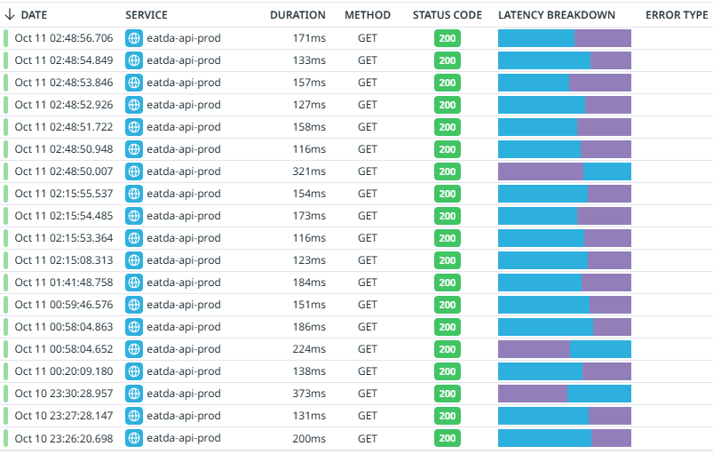 Eatda 서비스의 Datadog 모니터링 대시보드에서 P95 500 ms 이하 SLO 알람이 연속적으로 발생했습니다.