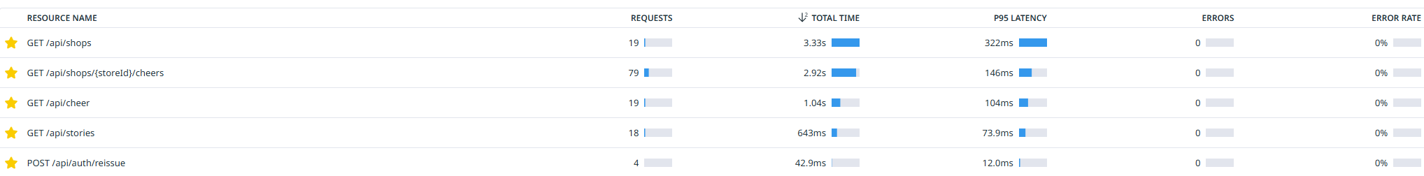 /api/shop, /api/store, /api/cheer API의 응답 시간이 주기적으로 500 ms를 초과했고,